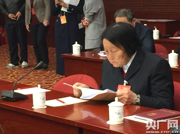 88岁的全国人大代表申纪兰审阅山西团拟提交全国人大的议案和建议