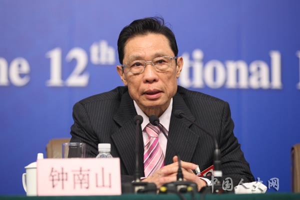 3月10日上午,十二届全国人大二次会议在梅地亚中心举行记者会,郭凤莲、钟南山等五位全国人大代表就“人大代表依法履职”的相关问题回答中外记者的提问。图为全国人大代表,中国工程院院士,广州呼吸疾病研究所所长、呼吸疾病国家重点实验室主任钟南山回答记者提问。罗荣 摄