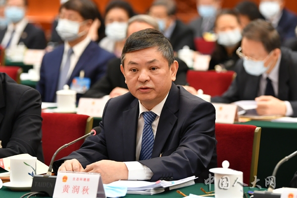 10月22日上午,十三届全国人大常委会第三十一次会议举行联组会议,就固体废物污染环境防治法执法检查报告进行专题询问。图为生态环境部部长黄润秋回答问题。冯涛 摄