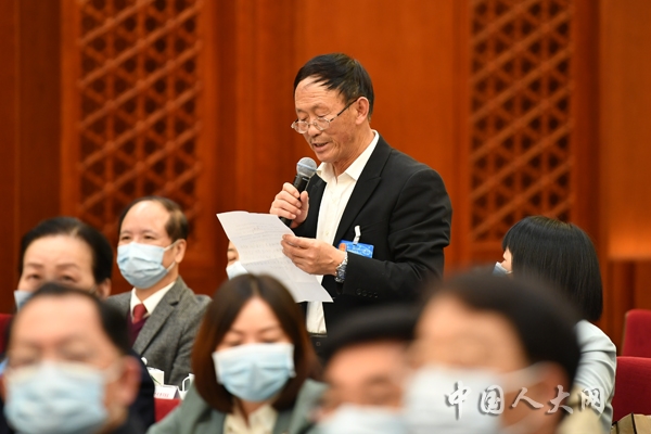 10月22日上午,十三届全国人大常委会第三十一次会议举行联组会议,就固体废物污染环境防治法执法检查报告进行专题询问。图为杨来法代表提问。冯涛 摄