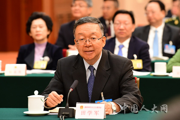 10月27日上午,十四届全国人大常委会第十八次会议举行联组会议,就关于2024年度企业国有资产(不含金融企业)管理情况的专项报告进行专题询问。图为教科文卫委副主任委员田学军提问。张峻铭 摄