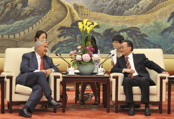 Wu Bangguo (R), chairman of the Standing Committee of China's National People's Congress, meets with Former French Prime Minister Jean-Pierre Raffarin (L) in Beijing, capital of China, on June 7, 2010. (Xinhua/Huang Jingwen)