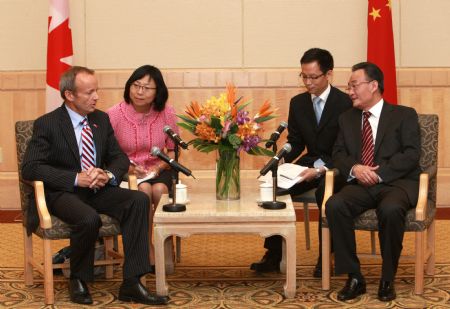 Wu Bangguo (R), chairman of the National People's Congress, the legislature of China, meets with Canadian International Trade Minister Stockwell Day in Vancouver, Canada, Aug. 31, 2009. (Xinhua/Pang Xinglei)