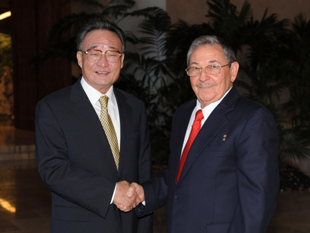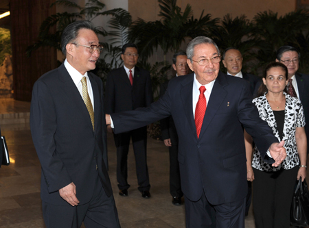 Wu Bangguo (L, Front), chairman of the Standing Committee of China's National People's Congress, meets with President of the Council of State of Cuba Raul Castro Ruz (R, Front) in Havana, capital of Cuba, on Sept. 2, 2009. (Xinhua/Pang Xinglei)