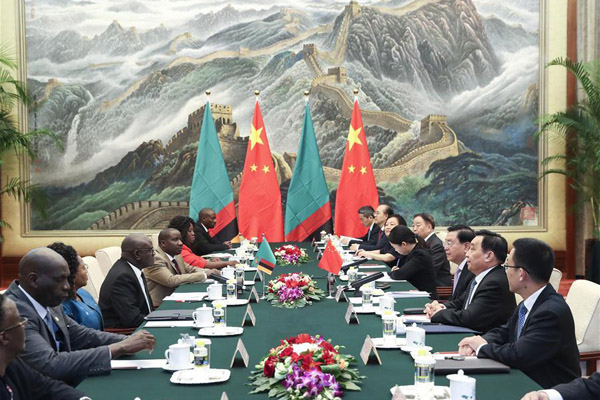 Zhang Dejiang, chairman of the Standing Committee of the National People's Congress (NPC), holds talks with Speaker of the National Assembly of Zambia Patrick Matibini in Beijing, capital of China, May 11, 2017. (Xinhua/Pang Xinglei)