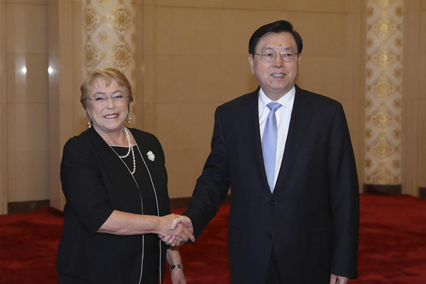 The two sides should exchange experience on country governance and offer supportive policies and legal protection to inject new vigor to bilateral relations, Zhang said in a meeting with Chilean President Michelle Bachelet, who is in Beijing to attend the Belt and Road Forum for International Cooperation scheduled for May 14 to 15.