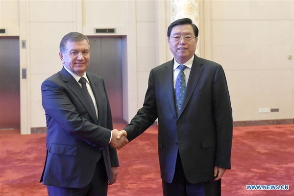 Zhang Dejiang (R), chairman of the Standing Committee of the National People's Congress, meets with Uzbek President Shavkat Mirziyoyev in Beijing, capital of China, May 13, 2017. (Xinhua/Zhang Duo)