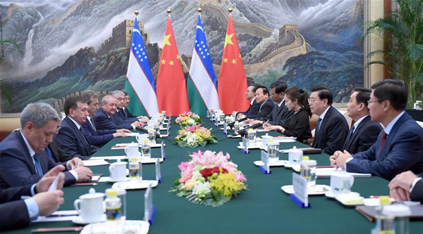 Zhang Dejiang (3rd R), chairman of the Standing Committee of the National People's Congress, meets with Uzbek President Shavkat Mirziyoyev in Beijing, capital of China, May 13, 2017. (Xinhua/Zhang Duo)