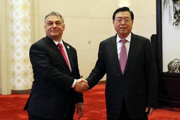 Zhang Dejiang (R), chairman of the Standing Committee of the National People's Congress (NPC), meets with Hungarian Prime Minister Viktor Orban, who is here for the Belt and Road Forum (BRF) for International Cooperation, at the Great Hall of the People in Beijing, capital of China, May 15, 2017. (Xinhua/Liu Weibing)