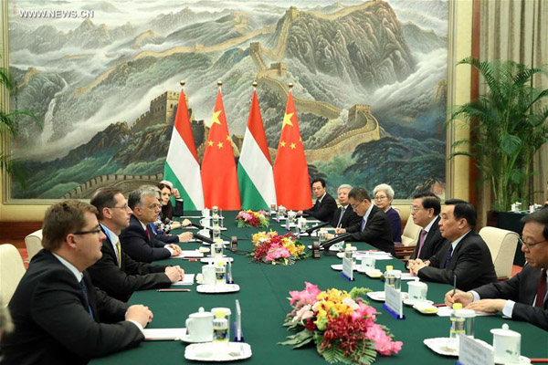 Zhang Dejiang (3rd R), chairman of the Standing Committee of the National People's Congress (NPC), meets with Hungarian Prime Minister Viktor Orban (3rd L), who is here for the Belt and Road Forum (BRF) for International Cooperation, at the Great Hall of the People in Beijing, capital of China, May 15, 2017. (Xinhua/Liu Weibing)