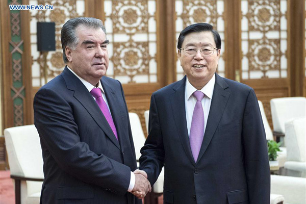 Zhang Dejiang (R), chairman of the Standing Committee of the National People's Congress (NPC), meets with Tajik President Emomali Rahmon at the Great Hall of the People in Beijing, capital of China, Aug. 31, 2017. (Xinhua/Li Tao)