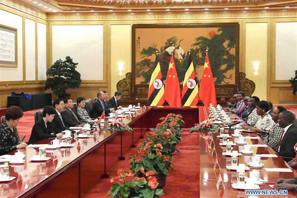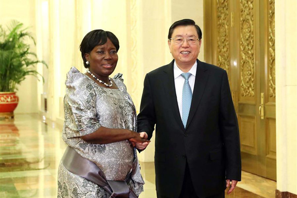 Zhang Dejiang, chairman of the Standing Committee of the National People's Congress(NPC), holds talks with Ugandan Speaker of Parliament Rebecca Kadaga in Beijing, capital of China, Aug. 24, 2017. (Xinhua/Liu Weibing)