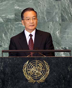 Chinese Premier Wen Jiabao delivers a speech at the annual high-level debate of the UN General Assembly in New York, the United States, Sept. 24, 2008. (Xinhua/Yao Dawei) |