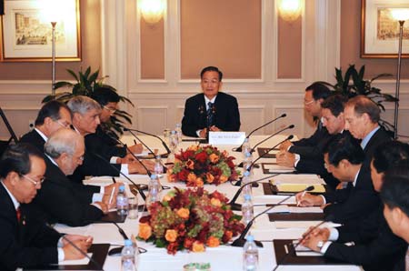 Chinese Premier Wen Jiabao (C) meets with U.S. financial specialists, in New York, the United States, Sept. 24, 2008.(Xinhua/Liu Jiansheng) |