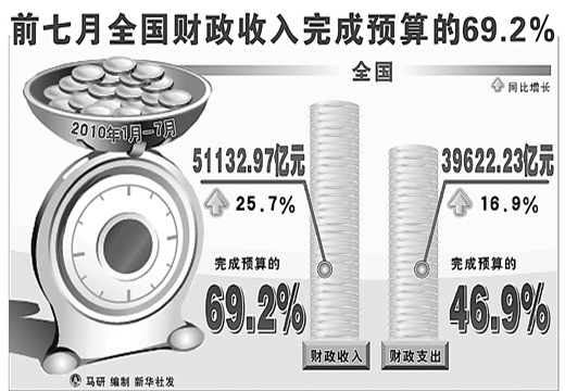报告说,1—7月,全国财政收入51132.97亿元,比2009年同期(以下简称同比)增加10460.92亿元,增长25.7%,完成预算的69.2%。其中,中央本级收入26970.41亿元,同比增长25.7%,完成预算的70.9%;地方本级收入24162.56亿元,同比增长25.7%,完成预算的67.4%。