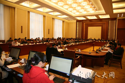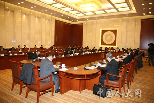 12月25日上午,十一届全国人大常委会第三十次会议举行分组会议,分组审议劳动合同法修正案草案,关于修改农业法个别条款的决定草案,关于授权国务院在广东省暂时调整部分法律规定的行政审批的决定草案,中央军事委员会关于提请审议批准中国人民解放军选举委员会人选的议案。图为分组会会场。中国人大网 向航 摄