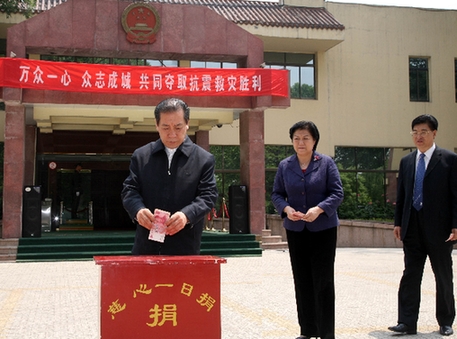 中国人大网讯 四川汶川发生强烈地震的消息传来,山东省人大常委会机关立即行动起来,组织干部职工踊跃捐款,以实际行动支援抗震救灾。 5月14日上午,常委会机关在常委会会议厅门前举行现场捐赠仪式。在“万众一心,众志成城,共同夺取抗震救灾胜利”的横幅下,全国人大代表、省人大常委会常务副主任高新亭,副主任时立军、鲍志强、崔曰臣、刘玉功、温孚江带头向四川地震灾区捐款。