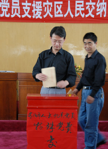 5月23日上午,市人大机关全体共产党员响应中组部的号召,踊跃交纳“特殊党费”,再一次把自己的爱心奉献给灾区人民。