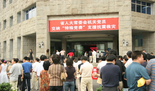 湖南省人大常委会机关,为了支援四川汶川抗震救灾,在2008年5月14日捐款180200.18元人民币的基础上,积极响应中央组织部、省委组织部的号召,5月23日下午全体党员在机关举行交纳“特殊党费”活动,常委会副主任戚和平、陈叔红、蔡力峰、肖雅瑜、刘莲玉等领导同志带头参加,全机关247名党员,共交纳“特殊党费”408000元。老领导吴志渊、齐寿良、孔安民、谢新颖、高锦屏、周时昌、颜永盛等同志也委托秘书交纳了“特殊党费”。(罗平)
