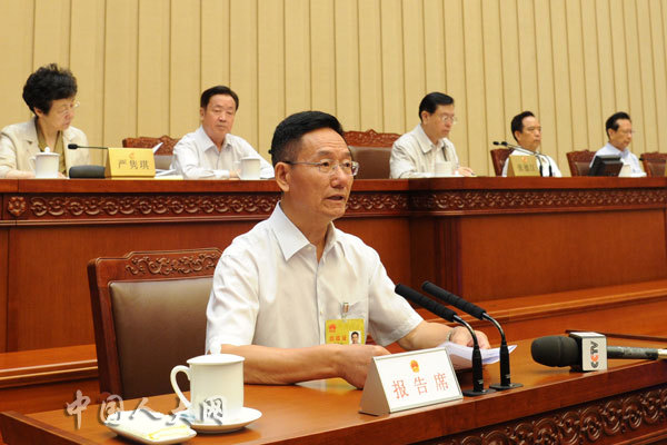 8月28日上午,十二届全国人大常委会第二十九次会议举行第一次全体会议。全国人大法律委员会副主任委员苏泽林作关于核安全法草案审议结果的报告。中国人大网 李杰摄