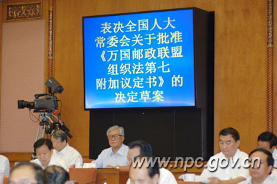 表决全国人大常委会关于批准《万国邮政联盟组织法第七附加议定书》的决定草案