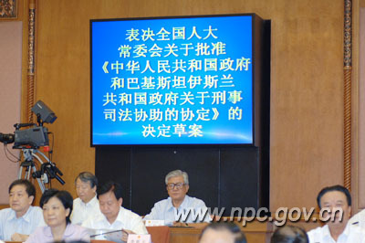 表决全国人大常委会关于批准《中华人民共和国政府和巴基斯坦伊斯兰共和国政府关于刑事司法协助的协定》的决定草案