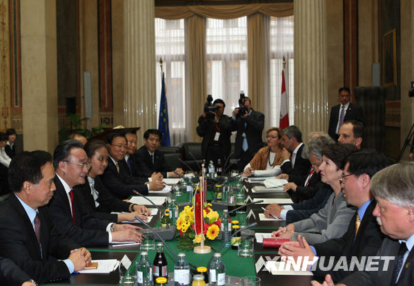5月15日,正在奥地利进行正式友好访问的全国人大常委会委员长吴邦国在维也纳会见奥地利国民议会议长普拉默(右三)。新华社记者刘卫兵摄