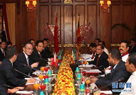 9月17日,中国全国人大常委会委员长吴邦国在科伦坡会见斯里兰卡总统拉贾帕克萨。 新华社记者刘卫兵摄