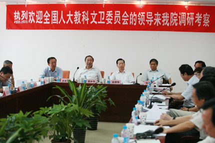 中国人大网讯 2008年7月15日,全国人大教科文卫委员会副主任委员金炳华、李树文、任茂东率调研组赴中国非物质文化遗产保护中心和国家图书馆进行立法调研,全国人大教科文卫委员会委员王文荣、方新、刘新成、李牧、庞丽娟和郑荃参加了调研。调研组听取了文化部周和平副部长、中国非物质文化遗产保护中心王文章主任和国家图书馆詹福瑞馆长有关情况的汇报,并召开会议与专家、学者进行座谈。