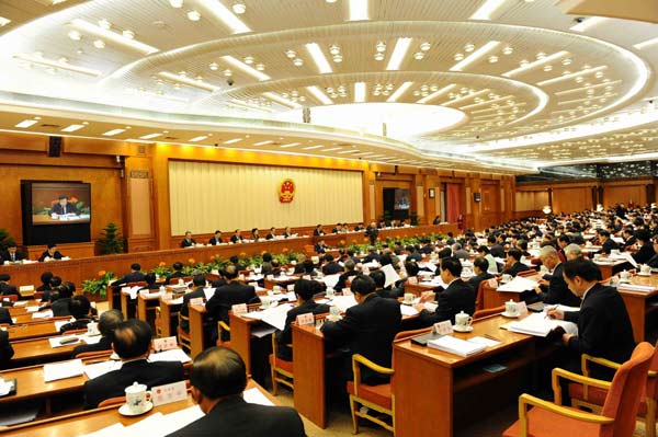 2月25日,十一届全国人大常委会第七次会议在北京人民大会堂举行第一次全体会议。吴邦国委员长主持会议。(新华社记者李涛摄)