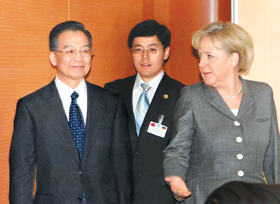 一月二十九日,中国国务院总理温家宝在柏林与德国总理默克尔举行会谈。新华社记者 兰红光摄