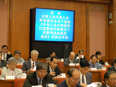 | 表决全国人民代表大会常务委员会关于批准《中华人民共和国和巴西联邦共和国关于刑事司法协助的条约》的决定草案 |