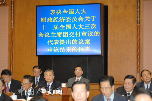 表决全国人大财政经济委员会关于十一届全国人大三次会议主席团交付审议的代表提出的议案审议结果的报告