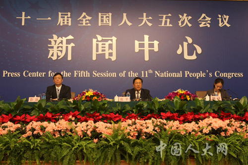 3月5日下午,十一届全国人大五次会议在梅地亚中心举行记者会,国家发展和改革委员会主任张平就“经济形势与宏观调控”的相关问题回答中外记者的提问。图为