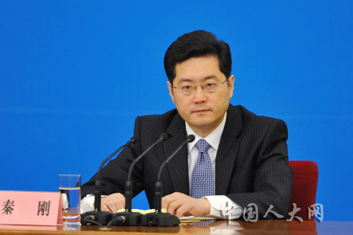 3月6日上午,十一届全国人大五次会议在人民大会堂三楼金色大厅举行记者会,外交部部长杨洁篪就“我国的对外政策和对外关系”问题答记者问。图为外交部新闻司司长秦刚。中国人大网 李杰 摄