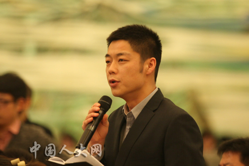 3月6日上午,十一届全国人大五次会议在人民大会堂三楼金色大厅举行记者会,外交部部长杨洁篪就“我国的对外政策和对外关系”问题答记者问。图为中央人民广播电台记者提问。罗荣 摄