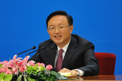 3月6日上午,十一届全国人大五次会议在人民大会堂三楼金色大厅举行记者会,外交部部长杨洁篪就“我国的对外政策和对外关系”问题答记者问。图为外交部部长杨洁篪回答记者提问。中国人大网 李杰 摄