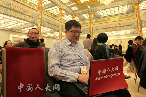 3月6日上午,十一届全国人大五次会议在人民大会堂三楼金色大厅举行记者会,外交部部长杨洁篪就“我国的对外政策和对外关系”问题答记者问。图为本网正在现场直播。罗荣 摄