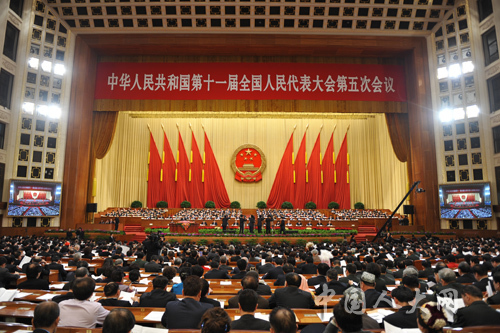 3月11日下午15时,第十一届全国人民代表大会第五次会议在人民大会堂举行第四次全体会议,听取最高人民法院院长王胜俊作最高人民法院工作报告,听取最高人民检察院检察长曹建明作最高人民检察院工作报告。图为全体会主席台。中国人大网 李杰 摄