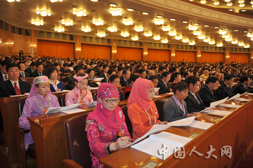 3月11日下午15时,第十一届全国人民代表大会第五次会议在人民大会堂举行第四次全体会议,听取最高人民法院院长王胜俊作最高人民法院工作报告,听取最高人民检察院检察长曹建明作最高人民检察院工作报告。图为代表听会。中国人大网 李杰 摄