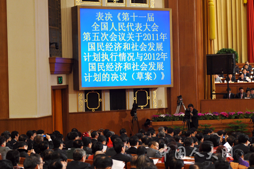 3月14日上午10时,第十一届全国人民代表大会第五次会议在人民大会堂举行闭幕会。图为表决关于2011年国民经济和社会发展计划执行情况与2012年国民经济和社会发展计划的决议草案。中国人大网 李杰 摄