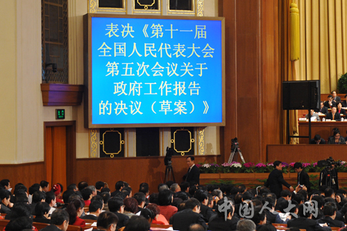 3月14日上午10时,第十一届全国人民代表大会第五次会议在人民大会堂举行闭幕会。图为表决关于政府工作报告的决议草案。中国人大网 李杰 摄