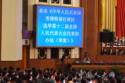 3月14日上午10时,第十一届全国人民代表大会第五次会议在人民大会堂举行闭幕会。图为表决中华人民共和国香港特别行政区选举第十二届全国人民代表大会代表的办法草案。中国人大网 李杰 摄