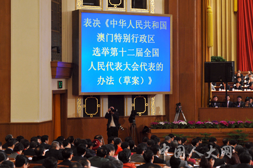 3月14日上午10时,第十一届全国人民代表大会第五次会议在人民大会堂举行闭幕会。图为表决中华人民共和国澳门特别行政区选举第十二届全国人民代表大会代表的办法草案。中国人大网 李杰 摄