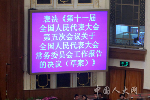 3月14日上午10时,第十一届全国人民代表大会第五次会议在人民大会堂举行闭幕会。图为表决关于全国人民代表大会常务委员会工作报告的决议草案。罗荣 摄