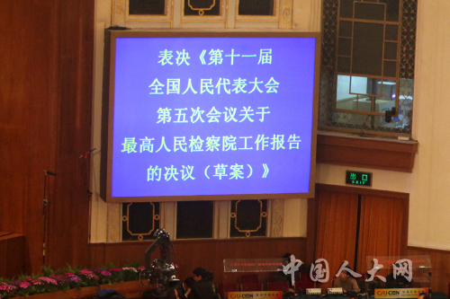 3月14日上午10时,第十一届全国人民代表大会第五次会议在人民大会堂举行闭幕会。图为表决关于最高人民检察院工作报告的决议草案。罗荣 摄
