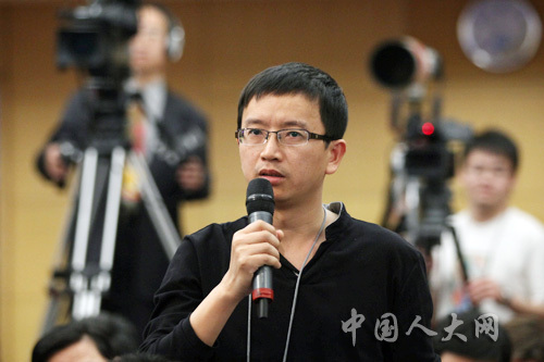 3月11日下午,十二届全国人大一次会议在梅地亚中心举行记者会,农业部副部长陈晓华,农业部总经济师、办公厅主任、新闻发言人毕美家就“增强农村发展活力,稳定发展粮食和农业生产”的相关问题回答中外记者的提问。图为时代周报记者提问。罗荣 摄