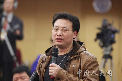 3月11日下午,十二届全国人大一次会议在梅地亚中心举行记者会,农业部副部长陈晓华,农业部总经济师、办公厅主任、新闻发言人毕美家就“增强农村发展活力,稳定发展粮食和农业生产”的相关问题回答中外记者的提问。图为经济日报、中国经济网记者提问。罗荣 摄