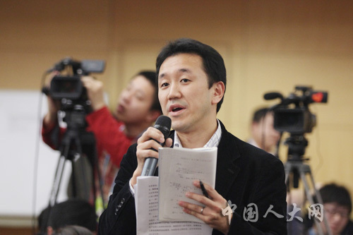 3月11日下午,十二届全国人大一次会议在梅地亚中心举行记者会,农业部副部长陈晓华,农业部总经济师、办公厅主任、新闻发言人毕美家就“增强农村发展活力,稳定发展粮食和农业生产”的相关问题回答中外记者的提问。图为日本朝日新闻记者提问。罗荣 摄