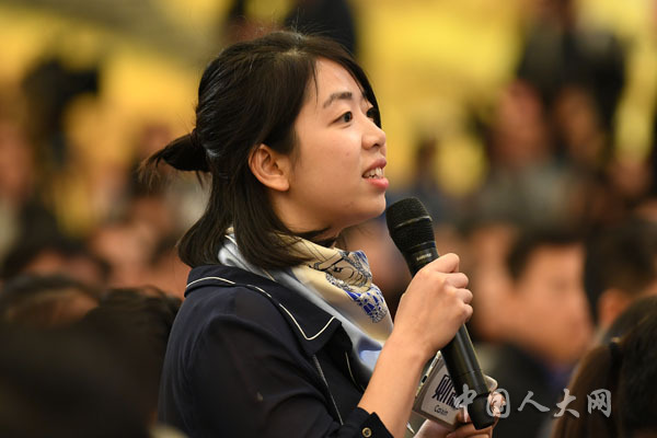 3月15日上午,国务院总理李克强在人民大会堂三楼金色大厅会见采访十二届全国人大五次会议的中外记者并回答记者提出的问题。图为财新网、财新周刊记者提问。中国人大网 李杰 摄